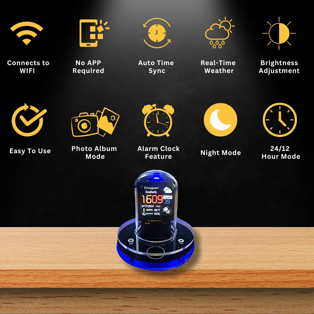A: It’s designed to be both a functional smart clock and a statement piece for your space. Whether placed on a desk, nightstand, gaming setup, or home office shelf, it gives you accurate time and weather updates while instantly elevating the aesthetic with its bold, retro-futuristic glow.